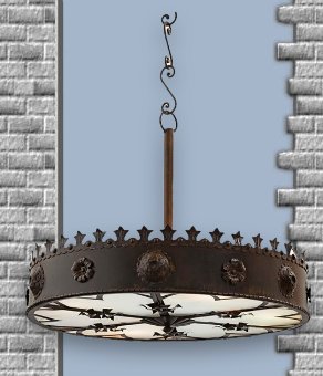 Lighting: Rustic looking electric fixtures in wood and metal - Iron - Pewter - free standing or ceiling hung iron or wooden Candelabras - Chandeliers - romantic candlesticks. Ornaments: Knights - medieval armor - Knights on horses - swords - Shields - Crests - Flags - Ornamental crosses - Dragons - Lions - medieval style goblets - Bowls - Fleur de Lis - The fleur-de-lis has appeared on countless European coats of arms and flags over the centuries. It is a symbol of royalty, purity and chastity. |